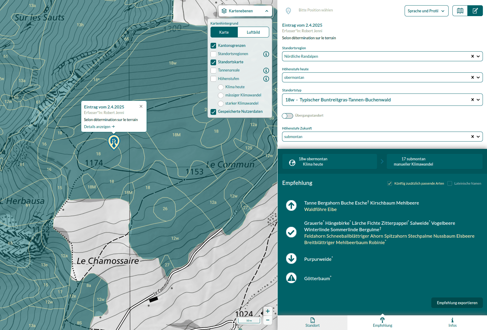 Trotz der umfangreichen technischen Anpassungen bleibt eines unverändert: Die wissenschaftliche Logik und die Datengrundlage der Tree App. Alle Empfehlungen basieren weiterhin auf den fundierten Erkenntnissen der WSL, inklusive der definierten Standorttypen, Höhenstufen und Klimaszenarien. Auch bestehende Profile und deren Inhalte wurden sorgfältig übernommen und angepasst.